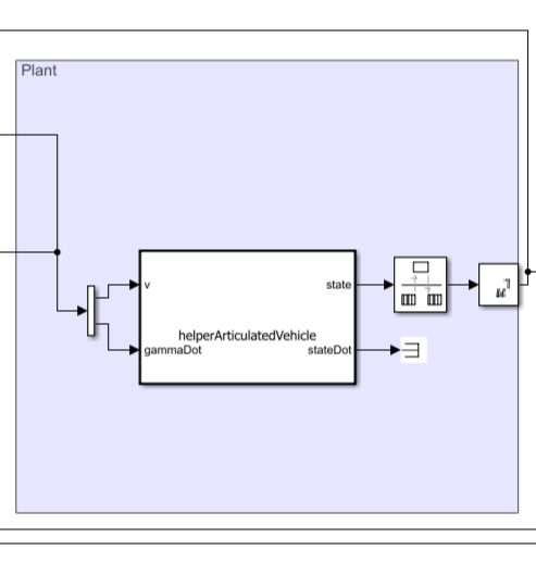 Plant: The Plant model simulates the simplified kinematics of the articulated steering vehicle model, applying the velocity commands to drive the system's motion toward the goal.