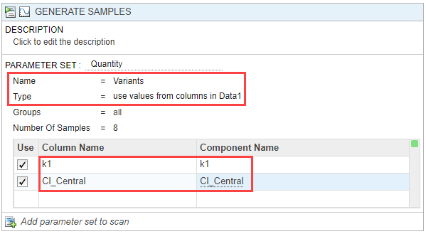 1. Under Parameter Set, use the default value Quantity but change Type to use values from columns in Data1 to to set up group-specific variants from data. Also, change Name to Variants.