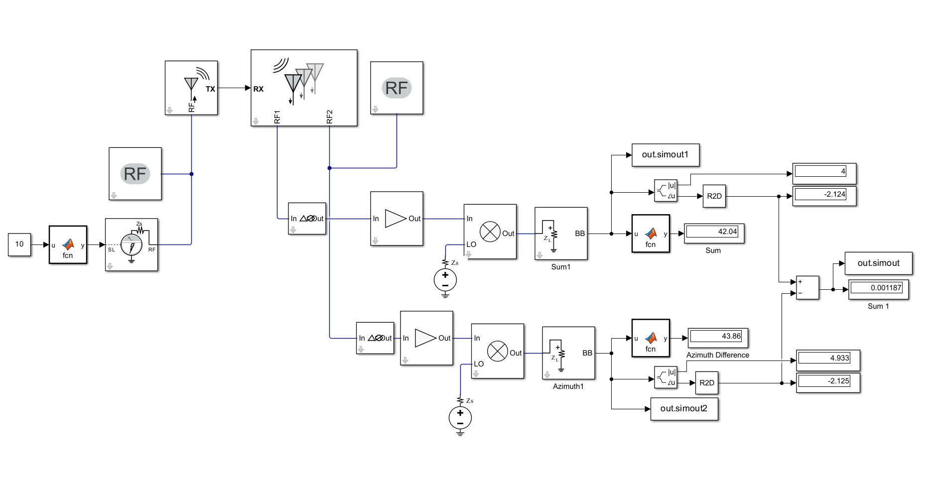 The model consists of a transmitter and a receiver, and the receiver section has two channels which are fed by a two-element linear array. The phase difference between the channels are calculated and the angle of arrival is estimated. The phase from each antenna needs to be calibrated to generate an accurate phase difference and hence the Phase Shifter blocks are connected to both the RF Channels.