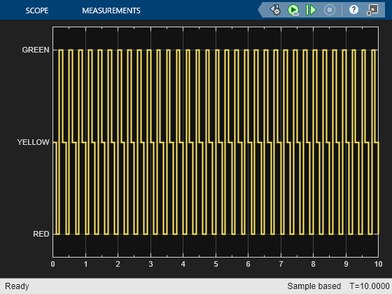 Simulate the model and visualize the results. The lamp shows the changing traffic light color during the simulation. The Scope shows how the signal type changes. Observe that at t = 0.1 s, the traffic light changes from yellow to red, and at t = 0.2 s, the light changes from red to green. In this simulation, the Simulation time per wall clock is set to 0.4