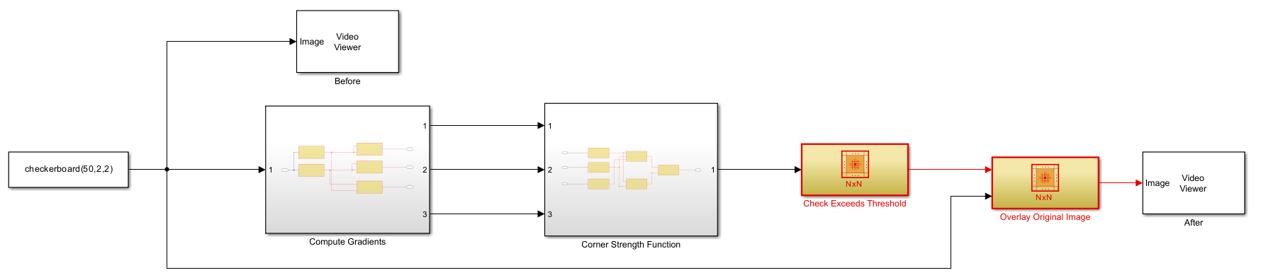 The model marks any pixel with a positive values as a corner, and uses two Video Viewer blocks from Computer Vision Toolbox™ to display the image with and without the corner markings.
