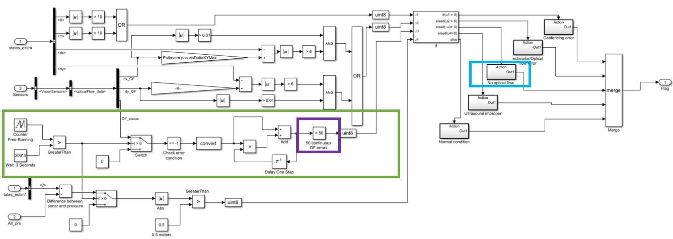 The maximum number of cycles for which there is no optical flow can be changed by changing the value of the Compare to constant block, highlighted in purple. Once the specified value is reached, the drone shuts down.
