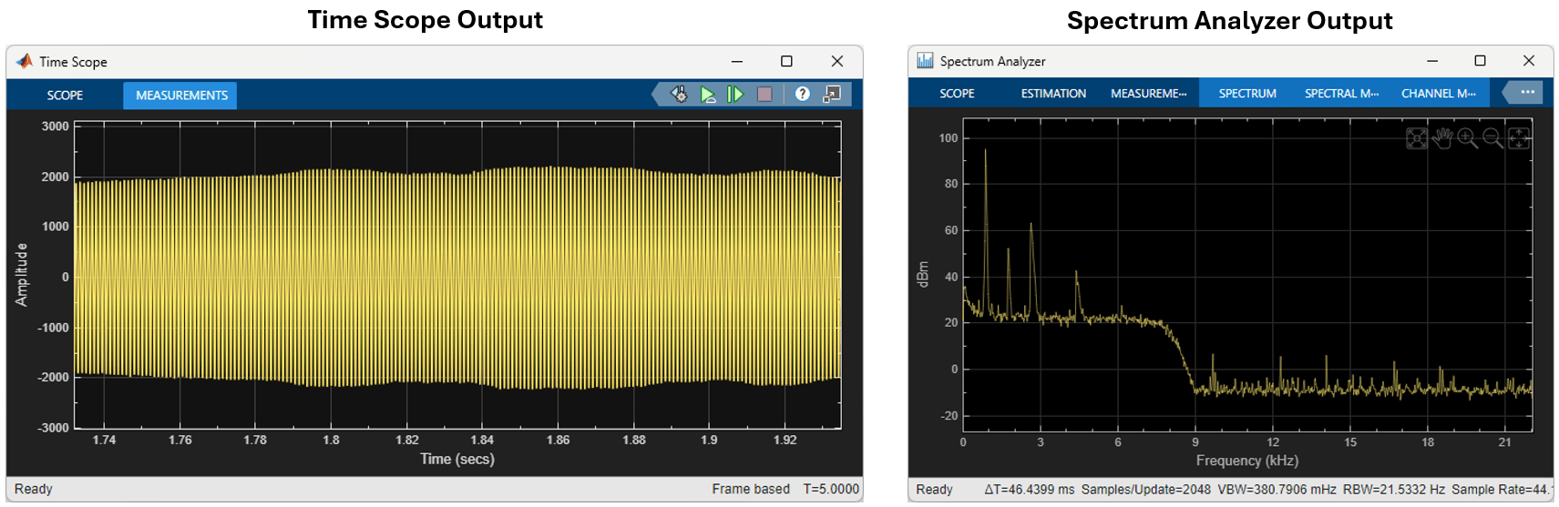 6. Observe the output in the Spectrum Analyzer and Time Scope blocks. Observe the shift in the peak frequency as it drops from 1000 Hz to 500 Hz on the Spectrum Analyzer.
