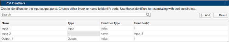 2. In the Constraints tab, click Port Identifiers in the toolstrip. In the Port Identifiers pane, click Add to create port identifiers for the input and output ports: