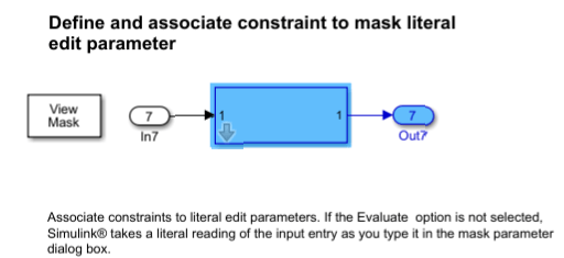 You can associate constraints to literal edit parameters. If the Evaluate option is not selected, the Simulink® software takes a literal reading of the input entry as you enter it in the mask parameter dialog box. For example, you can store an IP address in a literal edit parameter and validate it against a custom rule.