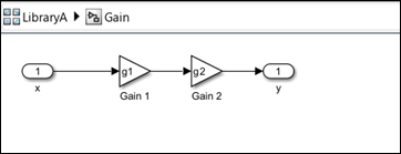 1. Open and unlock the library LibraryA containing a masked block Gain with a mask parameter g1 set to 2. To unlock the library, in the Library tab of the Simulink Toolstrip, in the Protect section, click Locked Library.