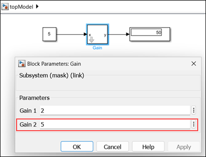 When you open the model topModel that contains links to this library block, the block parameter is updated using the Forwarding Table.