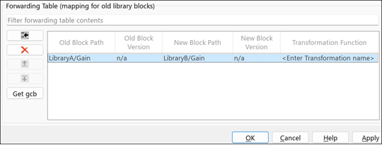 5. Create a mapping of the old block with its updated version in the Forwarding Table. Specify the block paths LibraryA/Gain and LibraryB/Gain of the library block in the Old Block Path and New Block Path columns, respectively, and click OK. To autofill the path, select the moved block in LibraryB, then select the New Block Path column in the newly added row, and click Get gcb.