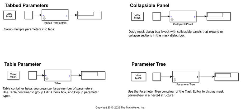 The example model slexMaskContainersExample containers such as tabs, collapsible panel, table, and parameter tree to group mask parameters on the mask dialog box. To insert a container in the Mask Editor, create a mask on a subsystem. In the Mask Editor, under Controls, click the desired container to add to the Parameters & Dialog pane.