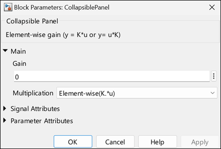 • Collapsible Panel — Use a panel to hide or show mask parameters in the mask dialog box, reducing visual clutter in complex dialog boxes. For an example of a tab container, in the model, double-click the block labeled CollapsiblePanel.