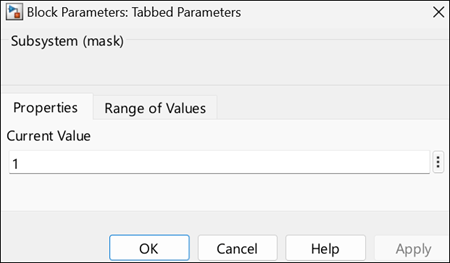 • Tab Container — Group dialog controls in the mask dialog box using tab container. A tab is contained within a tab container. A tab container can have multiple tabs. For an example of a tab container, in the model, double-click the block labeled Tabbed Parameters.