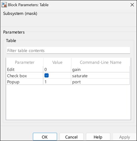 • Table — Use a table container to organize large number of mask parameters. A table container supports only edit, check box, and popup parameters. The table container displays the name, value, and programmatic names of mask parameters. A custom table parameter is a mask parameter that stores the values in a cell array, whereas a table container does not store parameter values. For an example of a tab container, in the model, double-click the block labeled Table.