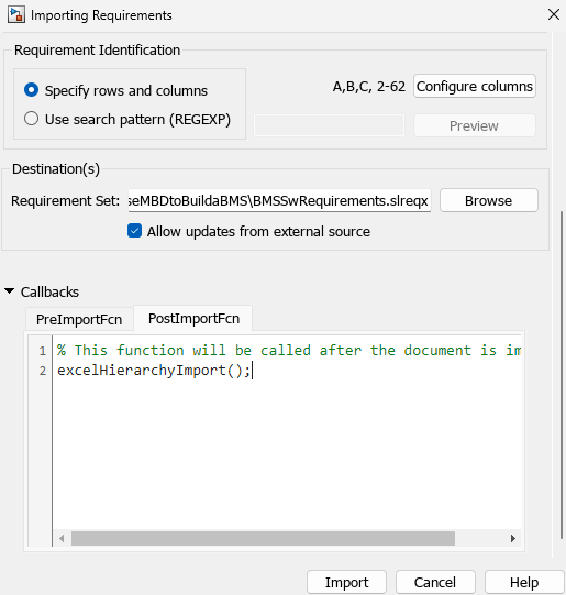 .slreqxformat with the correct hierarchy, under Callbacks, add the post-callback script namedexcelHierarchyImport.mand click Import.