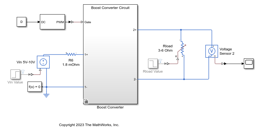 The plant model is an open-loop boost converter derived from the scdboostconverter model. For this example, the model does not include a voltage controller in a feedback loop.