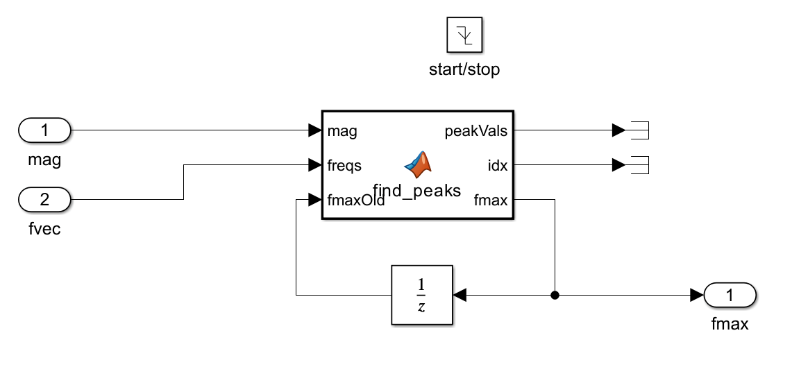 Once the frequency response is determined, the result can be used to determine the location (frequency) of the resonance. To do this a peak detection algorithm can be used. For this example, the MATLAB function findpeaks is used to determine the location of the resonance. This function is used inside of the MATLAB function block. For more information, see findpeaks (Signal Processing Toolbox).