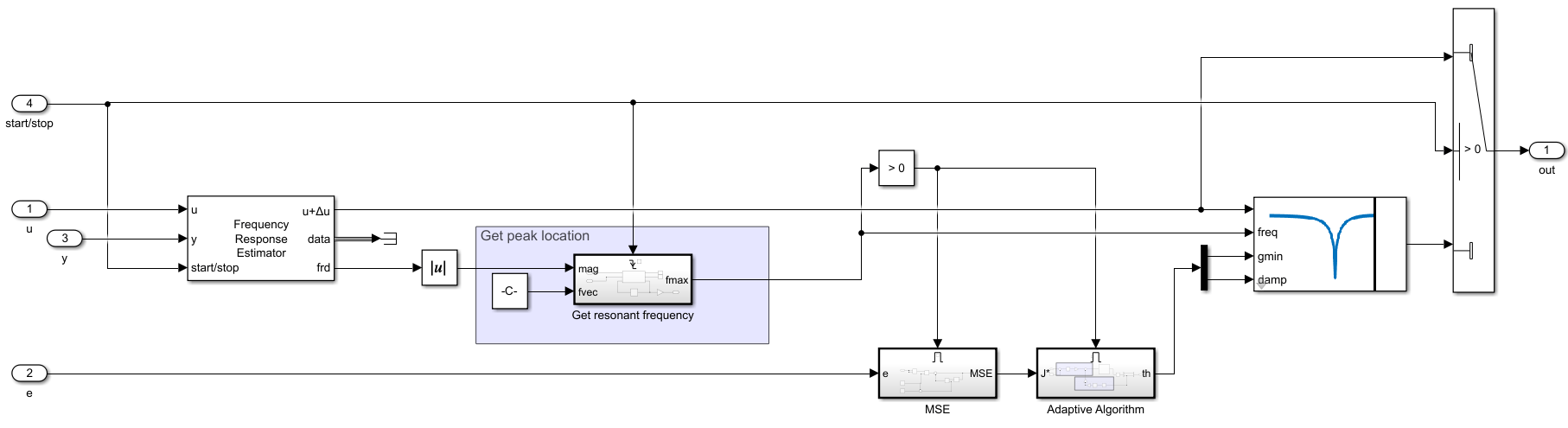 For this example the Adaptation Algorithm uses the Extremum Seeking Control block from Simulink® Control Design™ library, the FRF Estimator uses the Frequency Response Estimator (FRE) block, and the Frequency Detector uses the function findpeaks. The FRF estimation and frequency detection portions are enabled when an external start/stop signal is used to trigger the estimation. During this time the notch filter is bypassed and reenabled when a new frequency location for the notch is obtained. The following section discuss the details of these blocks and functions.
