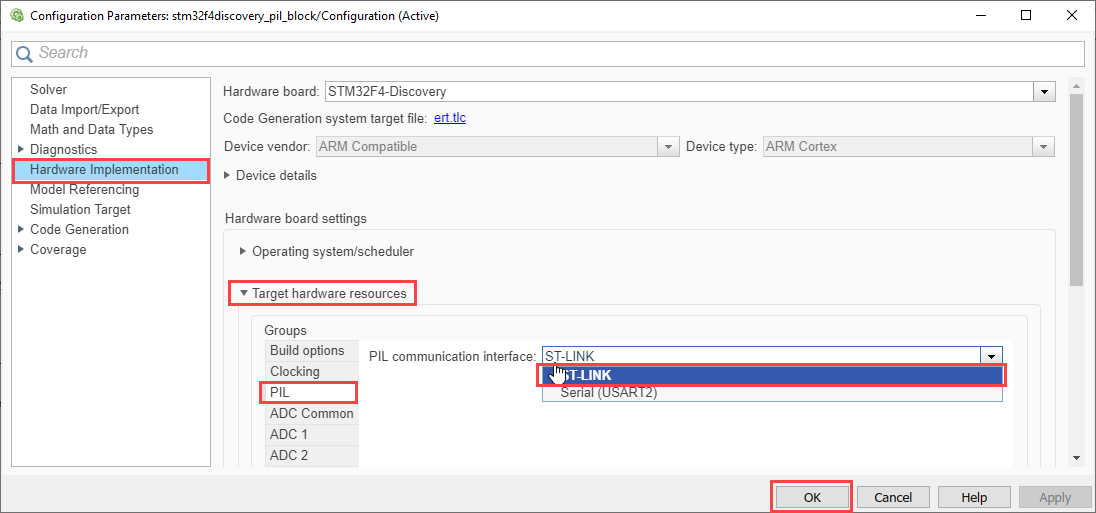 • As an example, you can check the settings in the stm32f4discovery_pil_block model, as shown.