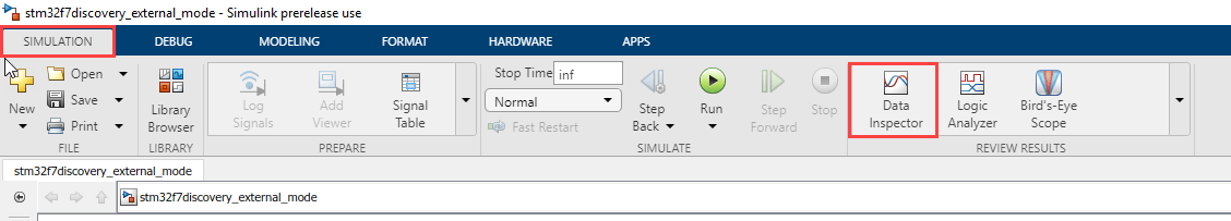 At this point, your model is running on the STMicroelectronics Discovery board and communicating with Simulink from Monitor & Tune. You can select the Simulation > Data Inspector button to view the logged signals, as shown.