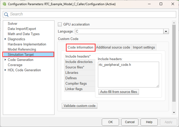 Once configured, Simulink includes the specified files during code generation and calls the functions when the model executes.