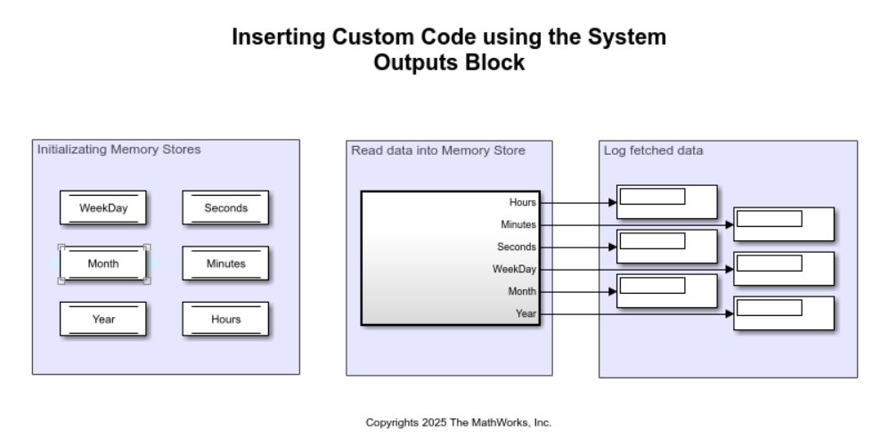 To insert custom C code at specific execution points, such as subsystem entry or exit, use the System Outputs block. This is useful when you need to run code for initialization, logging, or event handling rather than producing signal outputs.