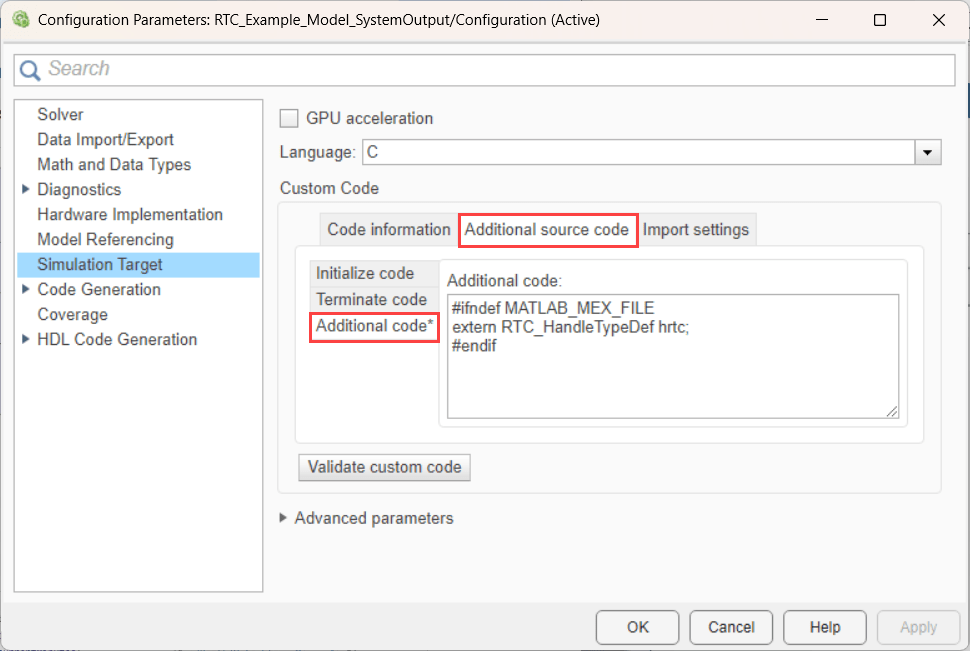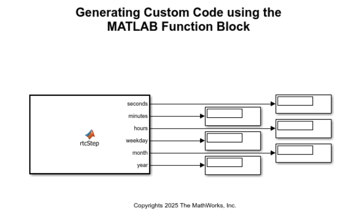 This example shows how to integrate custom C code into a Simulink® model by implementing a real-time clock (RTC) peripheral on STM32 processor based boards. The example shows how to call external driver code, exchange data between Simulink and the hardware, and compare different integration methods.