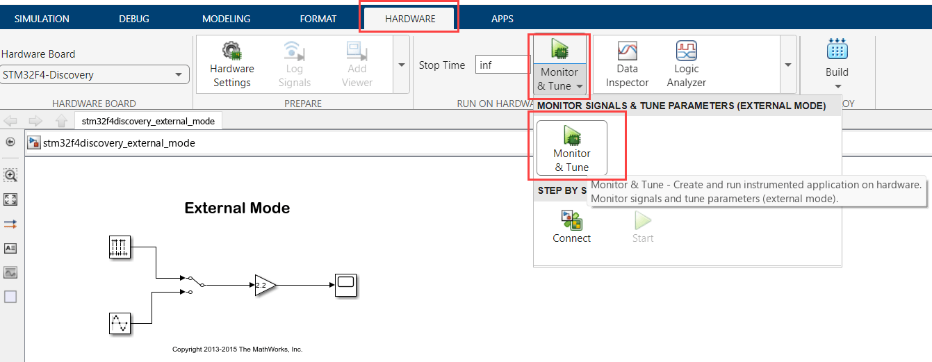 3. Configure the model to perform Monitor & Tune (External mode), as shown.
