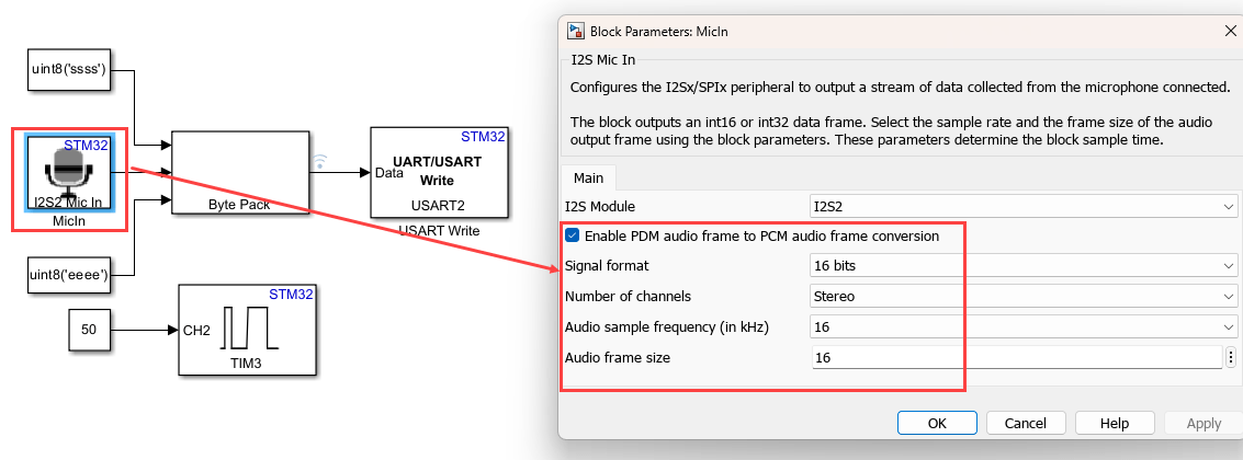 This example shows how to use the I2S Mic In block in a Simulink® model to acquire pulse density modulation (PDM) stereo audio data, convert it to pulse code modulation (PCM) format and visualize the audio signal using STM32™ Microcontroller Blockset.
