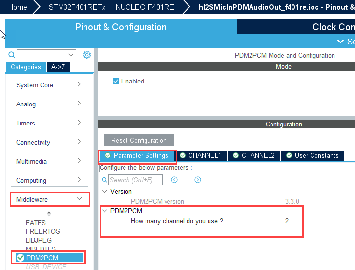 Specify the PDM2PCM channels that you configure in CubeMX for the corresponding I2S modules in the Configuration Parameters.