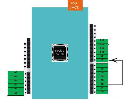 Connect the D8 (serial Tx) pin to the D2 (serial Rx) pin using a breadboard wire. The model writes the serial data to the D8 pin. This data is looped back to the D2 pin on the Nucleo board.