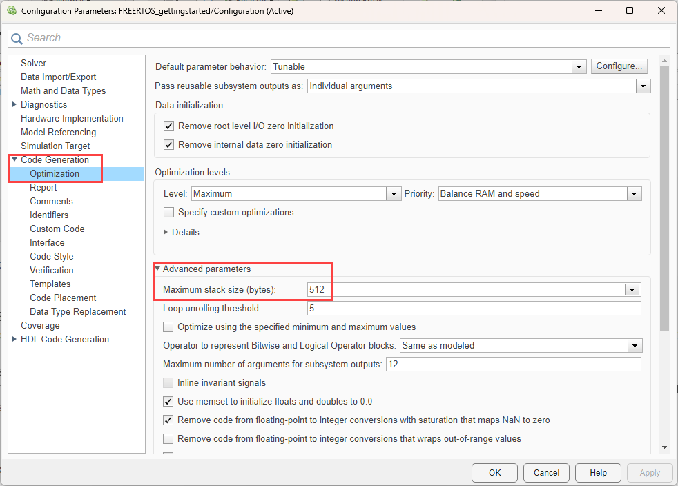 When using the FreeRTOS, the value that you specify in Configuration Parameters > Code Generation > Optimization > Advance parameters > Maximum stack size list applies to each thread. However, the specified stack size may not be fully utilized in some of the threads.