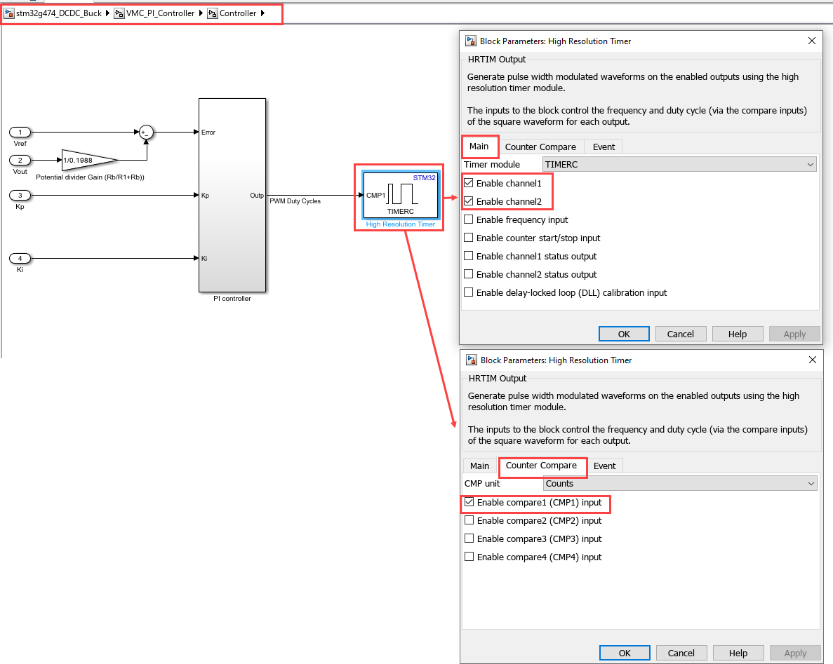Configure the HRTIM block to enable channel and counter compare. For Boost Converter, configure the Timer as Timer D.