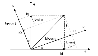 This block converts vectors in balanced two-phase orthogonal stationary systems into an orthogonal rotating reference frame. The transformation implements these equations