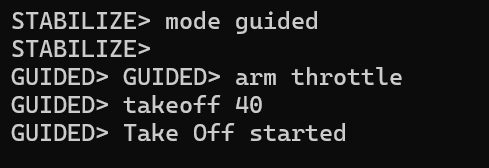 Use the takeoff command to ascend the drone to your desired altitude (for example, 40 meters as shown in previous commands).