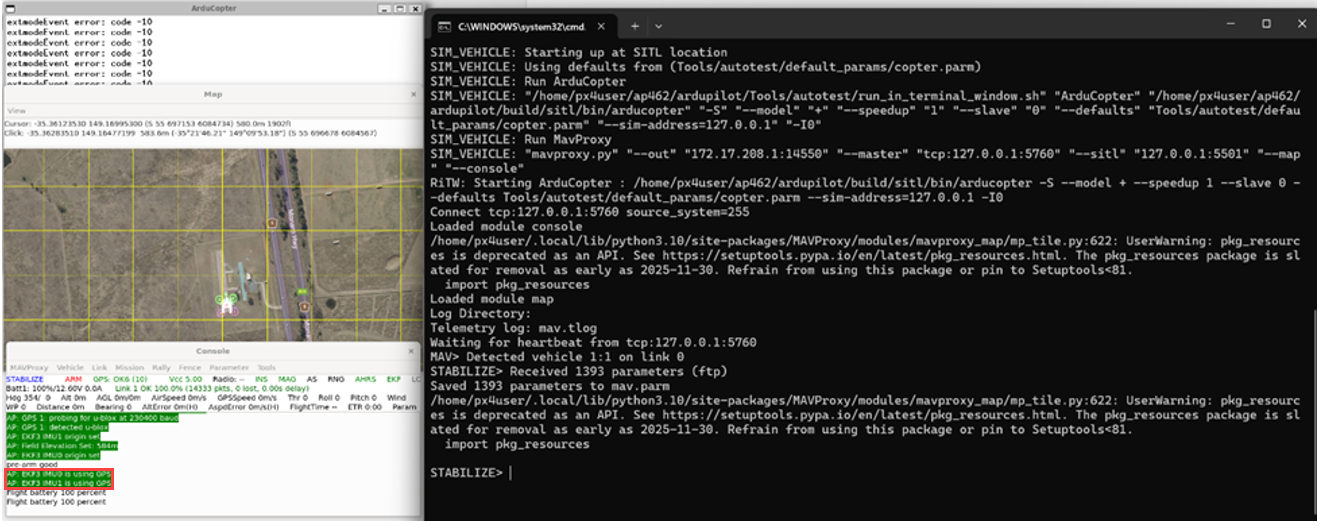 Once the build is finished, the ArduPilot SITL (Software-In-The-Loop) window will automatically open along with MAVProxy terminals. Simulink will then establish a connection with SITL, and you will see the simulation progress bar advancing in Simulink.