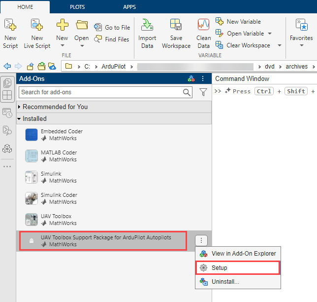 From the Add-Ons screen, you can locate the UAV Toolbox Support Package for ArduPilot® Autopilots and click Setup to launch the Hardware Setup screens at your convenience.
