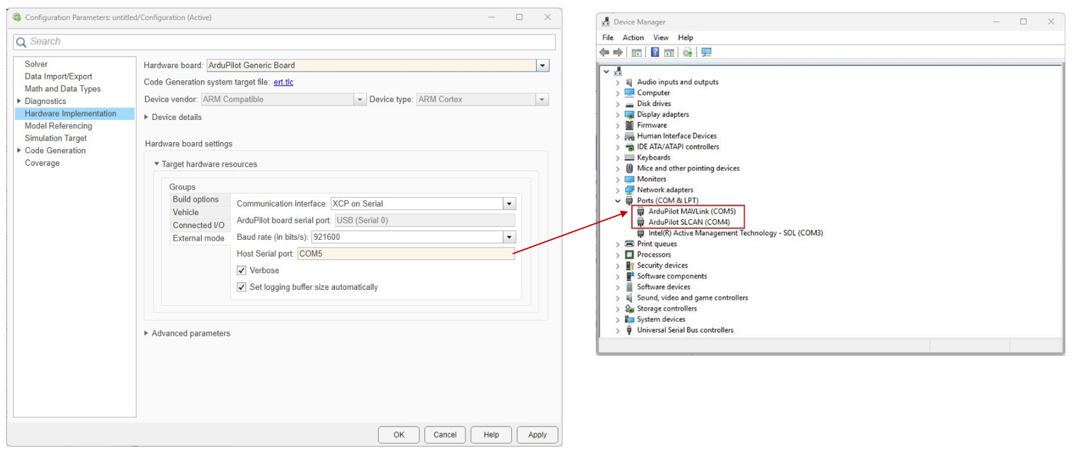 When working with ArduPilot firmware and Simulink models, it is important to correctly configure the COM ports for both firmware upload and MAVLink communication. This is especially relevant for hardware such as the CUAV-X7, where the bootloader and main firmware operate on different COM ports.