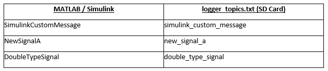 Note: There is a difference between the naming conventions used in MATLAB® and those used for PX4 logging. To use the generated uORB topic SimulinkCustomMessage you must change this before updating in the logger_topics.txt.