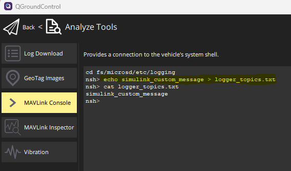1. Access the PX4 console by opening QGC and selecting Analyze Tools > MAVLink Console for logging the topics.