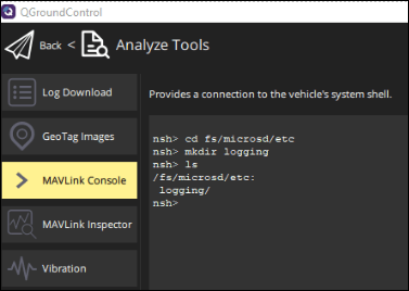 1. This method requires QGC to access the nsh console. In the QGC, navigate to Analyze Tools > MAVLink Console. If the console is not accessible, ensure to turn on the Enable MAVLink option as mentioned in Step 3, point 4.