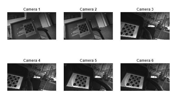 Download the calibration images containing two ChArUco boards that were captured from six cameras as per the guidelines outlined in Prepare Cameras and Capture Images for Multi-Camera Calibration. The calibration images were captured by moving the multi-camera system around the stationary ChArUco boards.