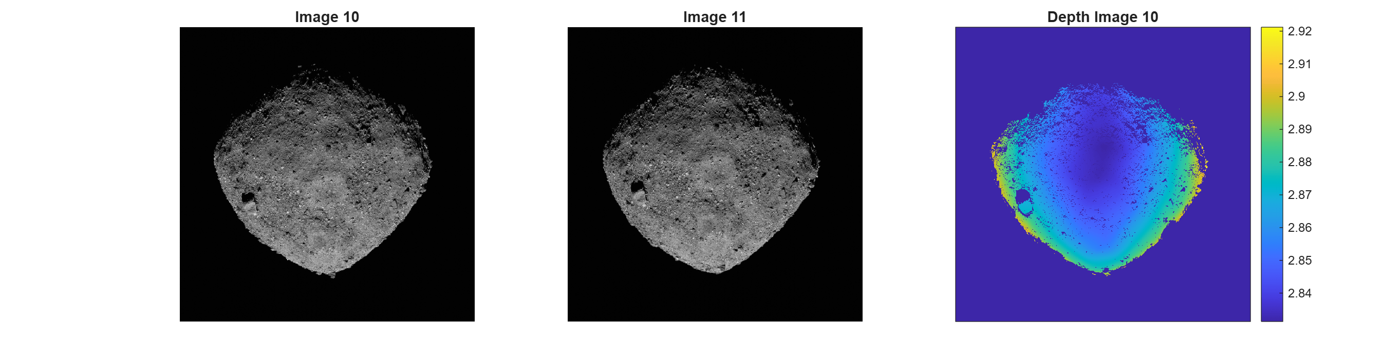 This example shows how to reconstruct a dense 3-D model of an asteroid from a sequence of images captured by NASA’s OSIRIS-REx spacecraft during its approach to the asteroid Bennu [1]. The workflow demonstrates a complete dense reconstruction pipeline using only RGB imagery. Starting with the camera intrinsics and the image sequence, the example first performs incremental structure-from-motion (SfM) to estimate camera poses, a view graph, and a sparse 3-D reconstruction. Dense optical flow from the RAFT deep learning model is then used to compute depth maps between overlapping views, which are filtered and combined to form a dense colored point cloud of the asteroid surface. Finally, Poisson surface reconstruction is applied to generate a smooth, watertight 3-D mesh suitable for visualization and further analysis.