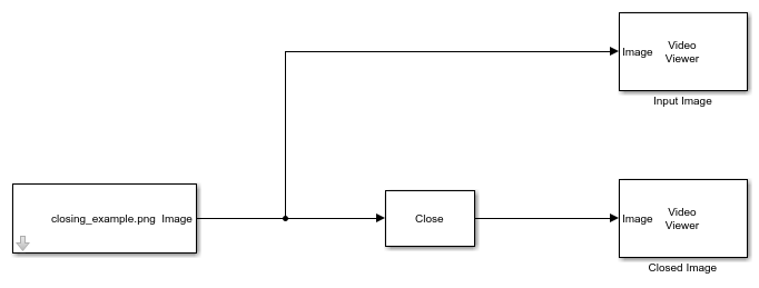 The model reads an input binary image by using the Image From File block. The Closing block performs the closing operation on the input image. The model uses a disk-shaped structuring element with a radius of 4. The model displays the output image by using the Video Viewer block.