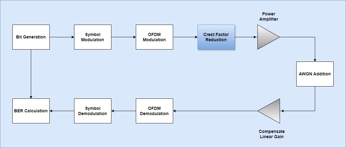 To evaluate the performance of the crest factor reduction algorithm, you can use different metrics, such as, PAPR, bit error rate (BER), and error vector magnitude (EVM).