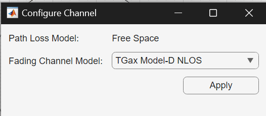 In the Configure Scenario section of the toolstrip, select Channel. Then, in the Configure Channel dialog box, set Fading Channel Model to TGax Model-D NLOS, and click Apply.