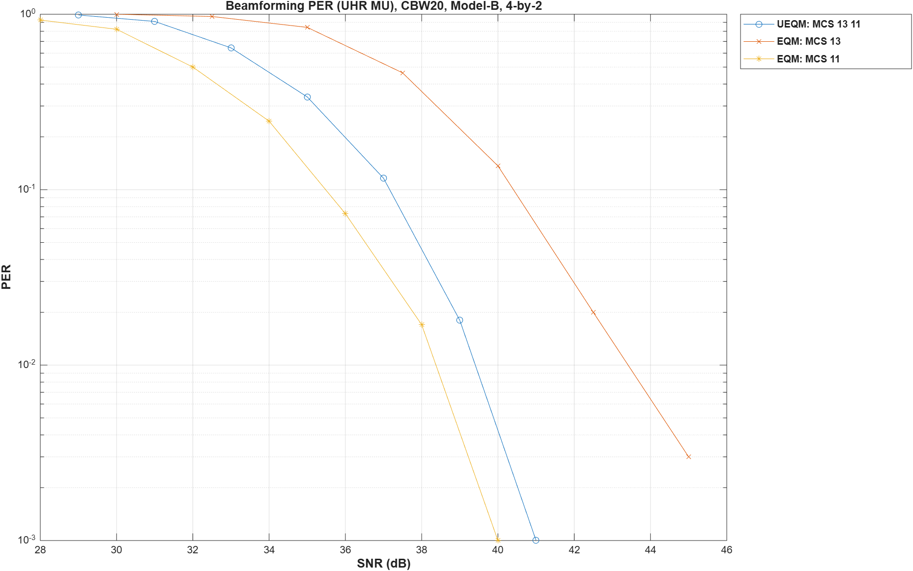 markers = 'ox*sd^v><ph+ox*sd^v><ph+'; figure; semilogy(snr,packetErrorRate.',['-' markers(1)]); hold on; grid on; xlabel('SNR (dB)'); ylabel('PER'); if isscalar(mcs) dataStr = sprintf('MCS %d',mcs); else mcsStr = cell(1,NumSTS); for iNumSTSs = 1:NumSTS mcsStr{iNumSTSs} = sprintf('%d ',mcs(iNumSTSs)); end dataStr = strjoin(['MCS', mcsStr]); end legend(dataStr,'Location','NorthEastOutside'); title(['PER (UHR MU), ' num2str(cfgUHRBase.ChannelBandwidth) ', Model-B, ' num2str(NumTxAnts) '-by-' num2str(NumRxAnts)]);