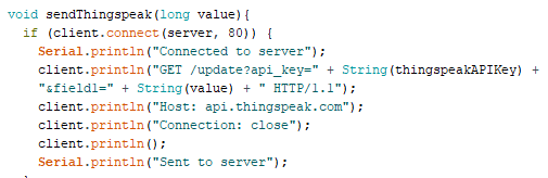 //Serial.println(val1);//Prepare GET string String getStr = "GET /update?api_key="; getStr += apiKey; getStr += "&field1="; getStr += val1; getStr +="\r\n";
