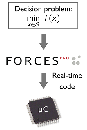 FORCES Pro generates a tailored algorithm to compute optimal solutions to the given problem. The algorithm is generated as C code that is independent of external libraries. As a result, it can be deployed on any hardware platform for which a C compiler is available, e.g. desktop computers, ARM® microprocessors, Speedgoat or dSPACE® target computers. By exploiting the problem structure, the tailored algorithm performs orders of magnitude faster than standard optimization software packages. Optimization problem classes that can be handled include LPs, QPs, QCQPs, NLPs, SOCPs, and binary decision problems.